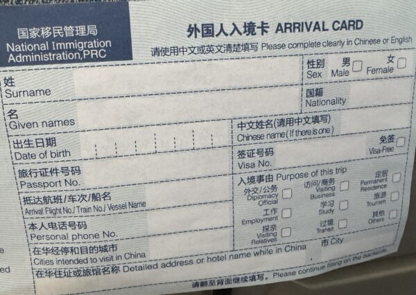 中国に入国する際、機内などで配布される「外国人入境カード(Arrival Card)」の記入が必要です。