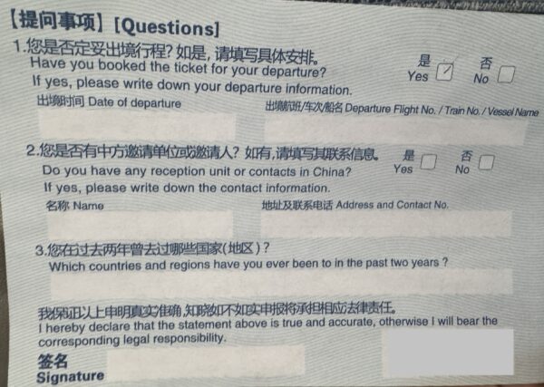 中国入国カードの記入方法
